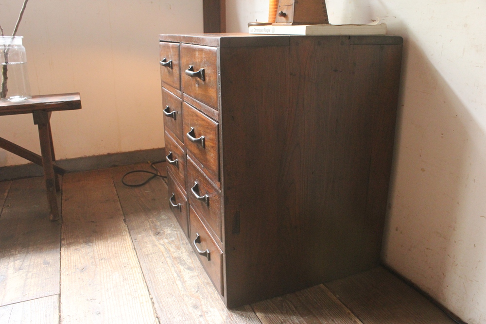 欅のチェストです。ケヤキらしい美しく、凜とした杢目です。こういうチェストをケヤキで作るのはとても珍しいことです。ソファの横やベットサイドのナイトテーブルにしたり、照明や読みかけの本や飲み物など置いてサイドテーブル的にも使えます。引き出しには見た目よく小さいモノが全部片づきますよ。