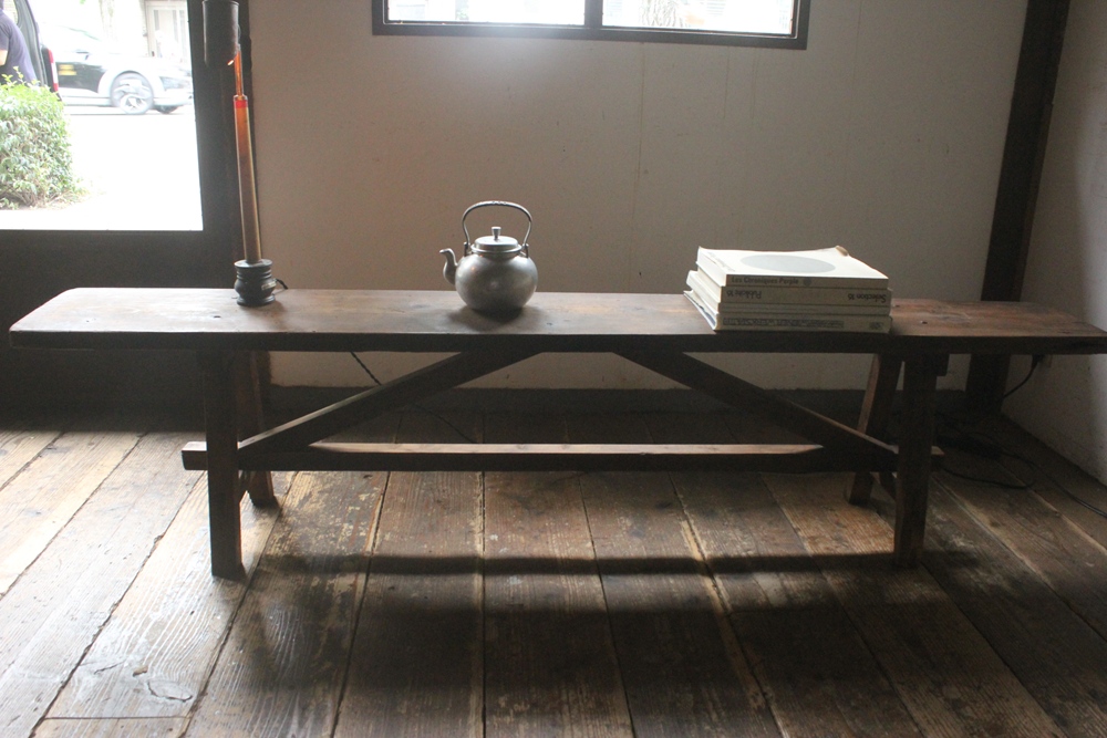 松の木のベンチです。松の一枚板で構成されています。なんとも良い味です。学校で使われていたものですが、支えが覗き込まないと見えないデザインでとても美しいです。見た目は華奢なのに、とてもしっかりしています。座っても良し、テレビ台にしても良し、本棚にしても良さそう。楽しそうです。