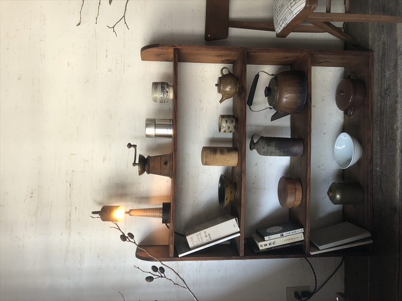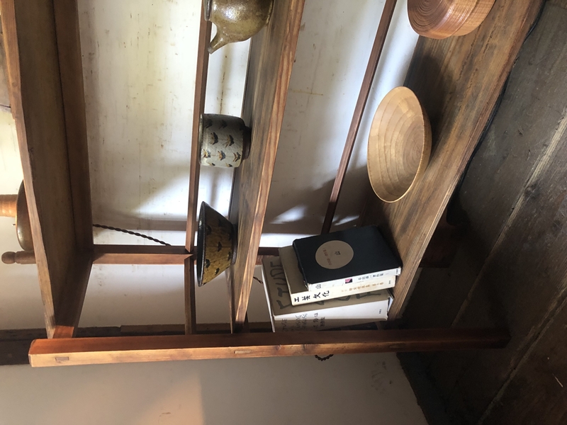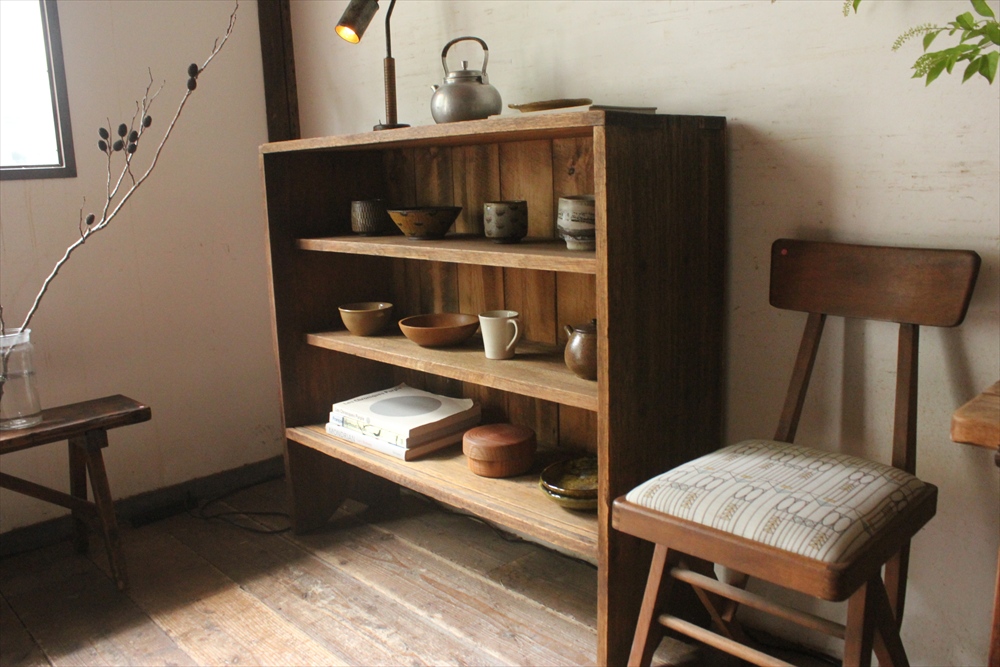 上の段はA4サイズも入ります。本棚にしたり、お茶まわりのものを置いたり、台所で使っても良さそうです。李朝のような静けさ、民芸のあたたかみがありますよ。松と栗の木のとてもいい雰囲気です。