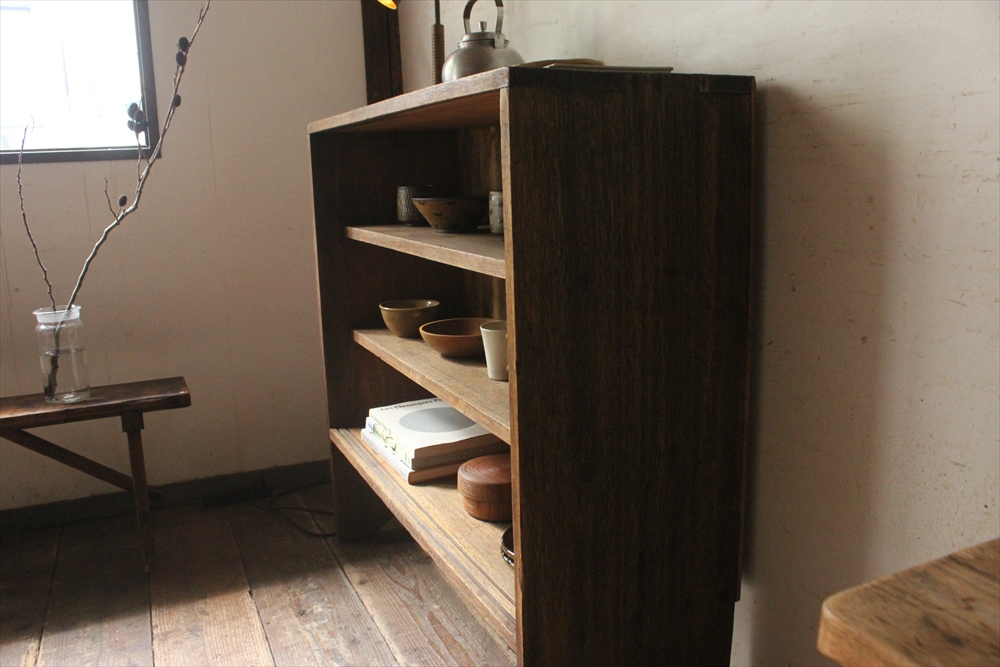 杉の棚です。燻された黒に近い茶色で良い味です。渋めの器などにも似合います。器や本やいろいろ収納できます。背板がカッコいいので間仕切りにしてもいいですね。有りそうで無いかんじの棚です。