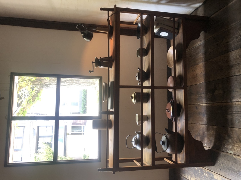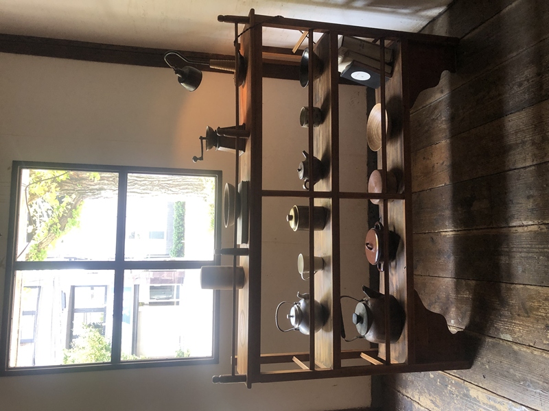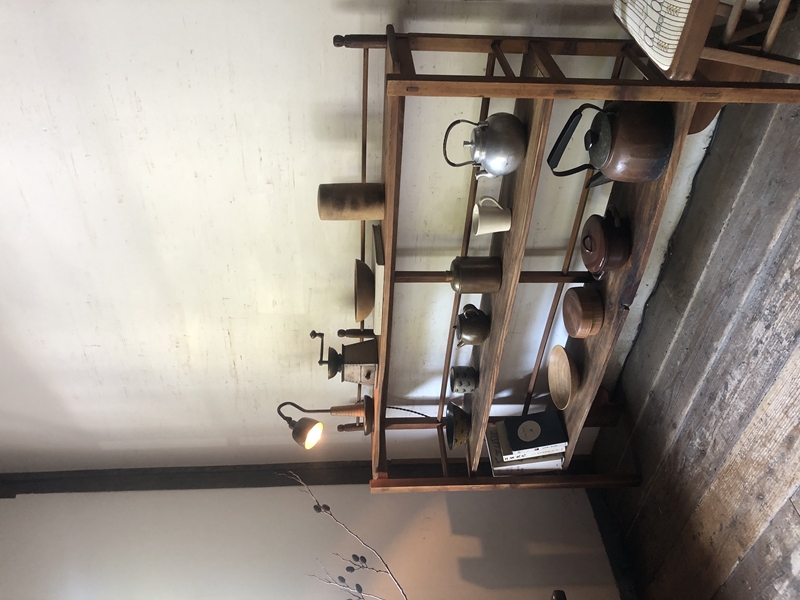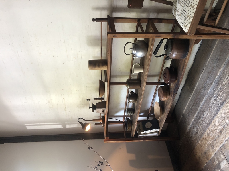 杉の棚です。とても渋く、いい味の杢目です。背板までカッコいいです。間仕切りにしてもいいくらい。器や本などいい感じに飾れるという雰囲気です。奥行が狭いので圧迫感なく置けます。ショップの什器にも抜群ですね。