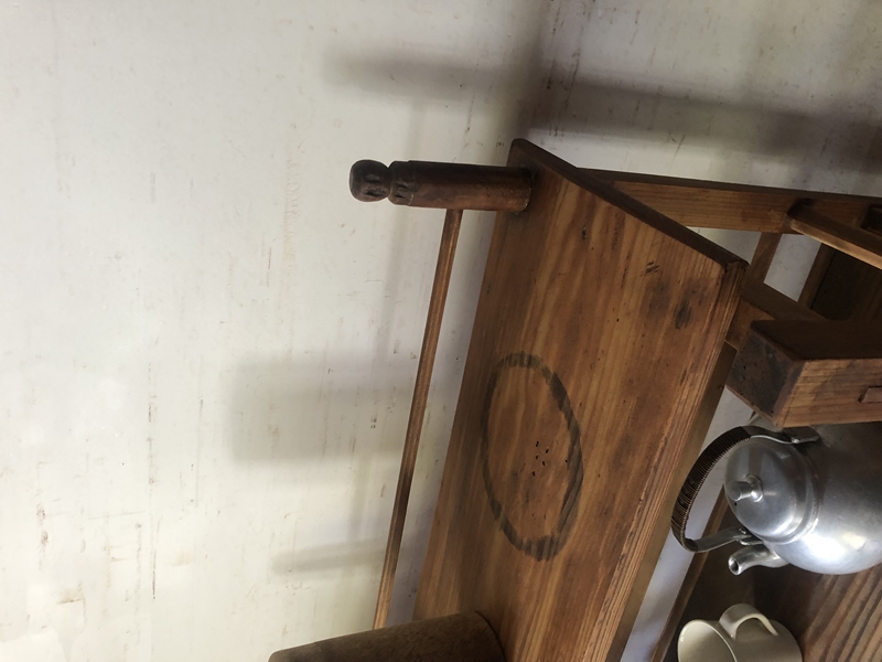 ラワンの棚です。分厚いラワンで素朴でいい味です。背板も味のいい杉の木です。脚付きで珍しいです。壁に付けても、間仕切りにしてカウンターっぽくも使えます。上で軽作業も出来ますし、お店のレジカウンターにもなりますよ。扉がない食器棚にもいいですね。天板もしっかりしてますので家電を置いても大丈夫です。