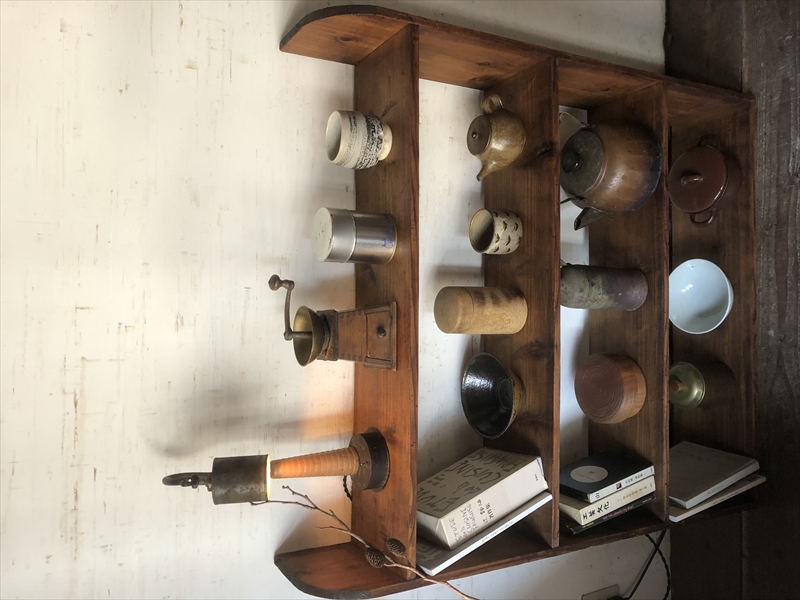 杉の棚です。味のいい杉の杢目です。台所で道具類や食器など置いたり、お茶や珈琲まわりのモノ置いたり、間仕切りにして植物と本など置いたり、洋服やバック、帽子など収納したり、色々便利に使えます。