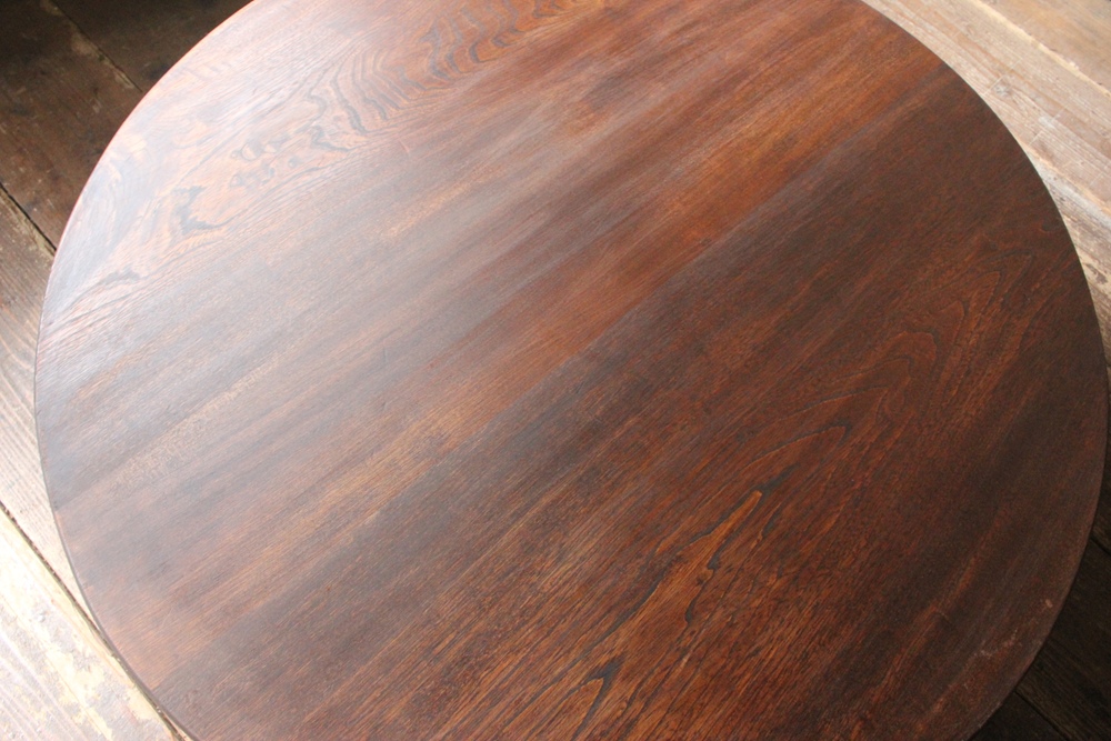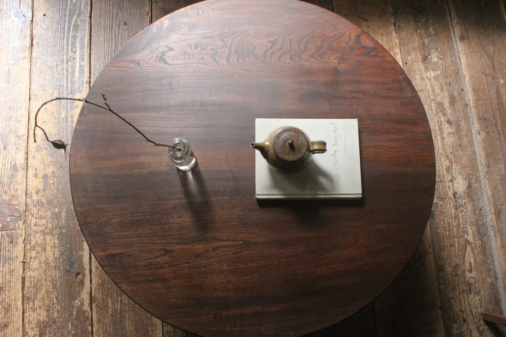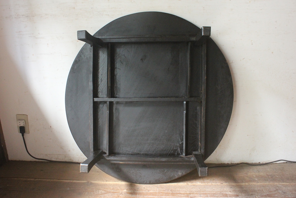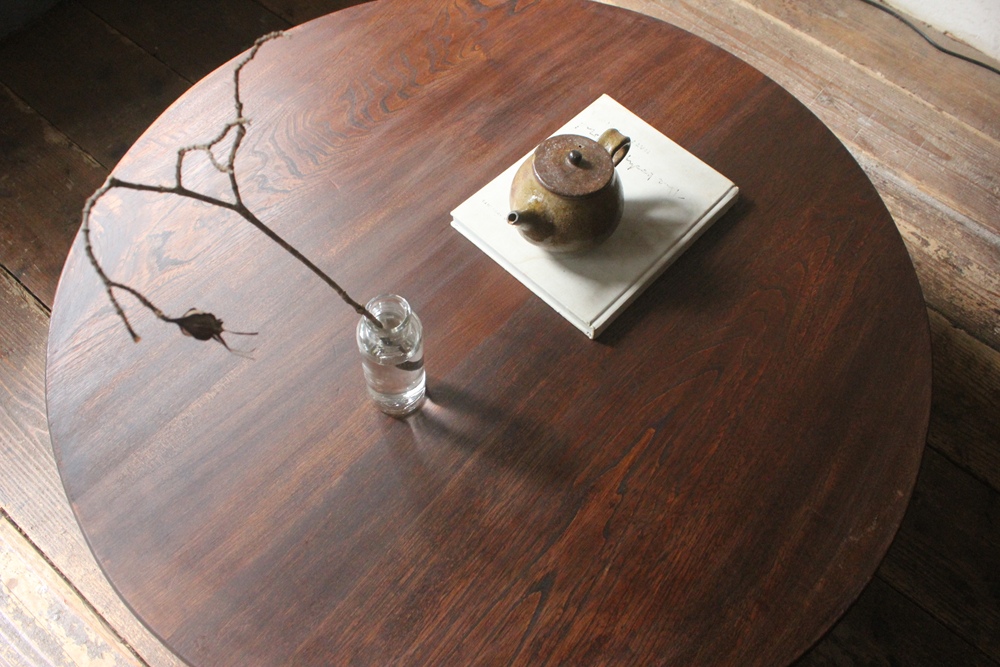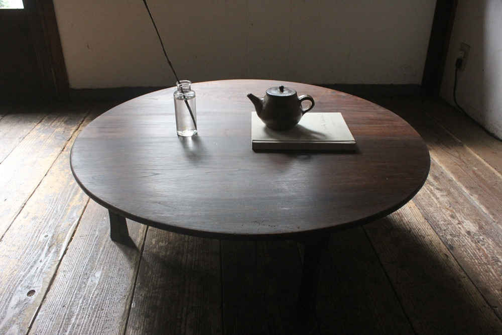 センの一枚板のちゃぶ台です。一枚板で美しいのに焦げてるとことかあって愛嬌があります。このちゃぶ台はとても美しい意匠ですが構造的に痛んでいるものが多いので今回のは珍しいです。直せる範囲の状態で出てきました。ふたりのご飯やちょこっとお茶のんだり、お酒のんだり気軽に使えます。脚もシャレてますよ。折りたたみ出来ます。