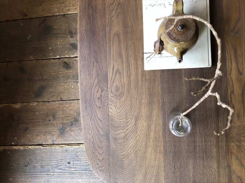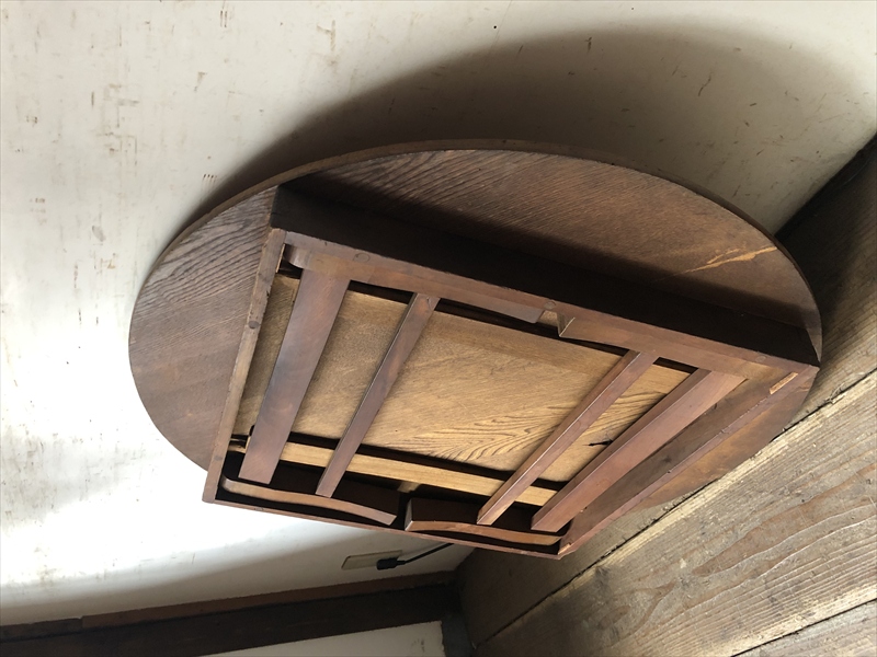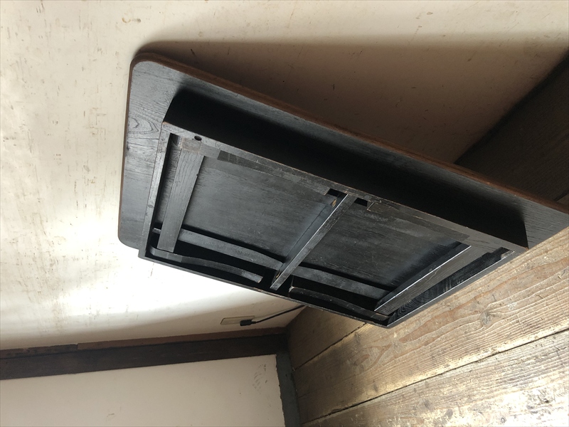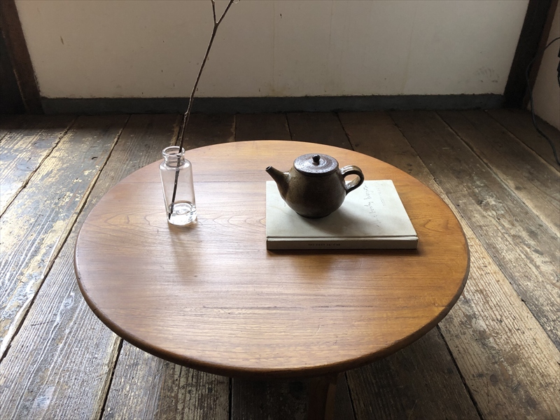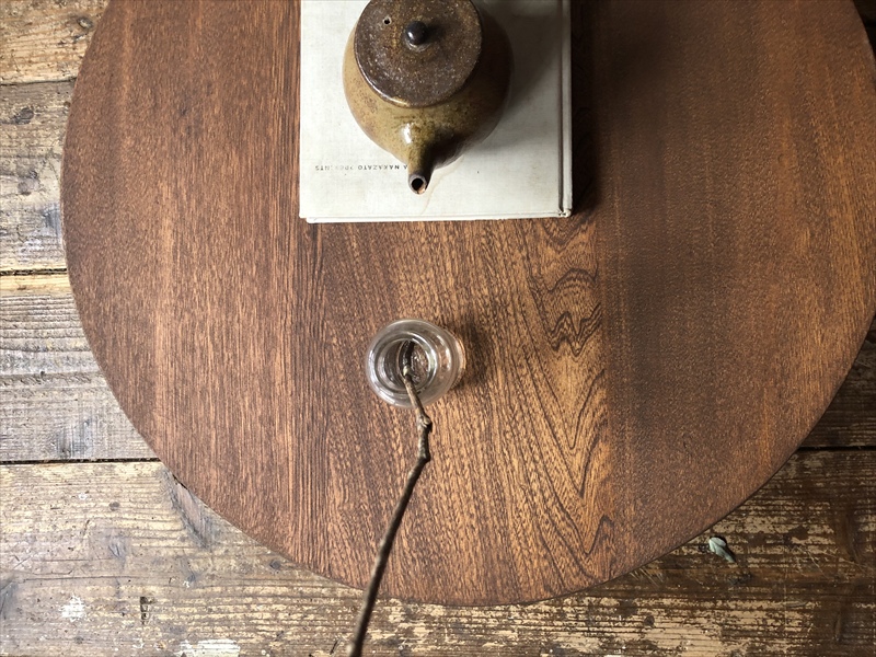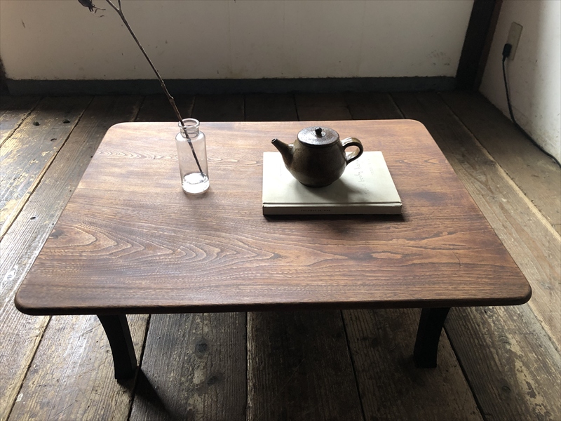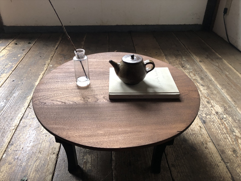 天板は山桜かカツラの木です。どっちでしょうか。脚は栗です。折りたたみはできませんが、出しっぱなしでもじゃまにならないサイズ感です。ふたりくらいのご飯や、和室でお茶を飲んだり楽しめます。
