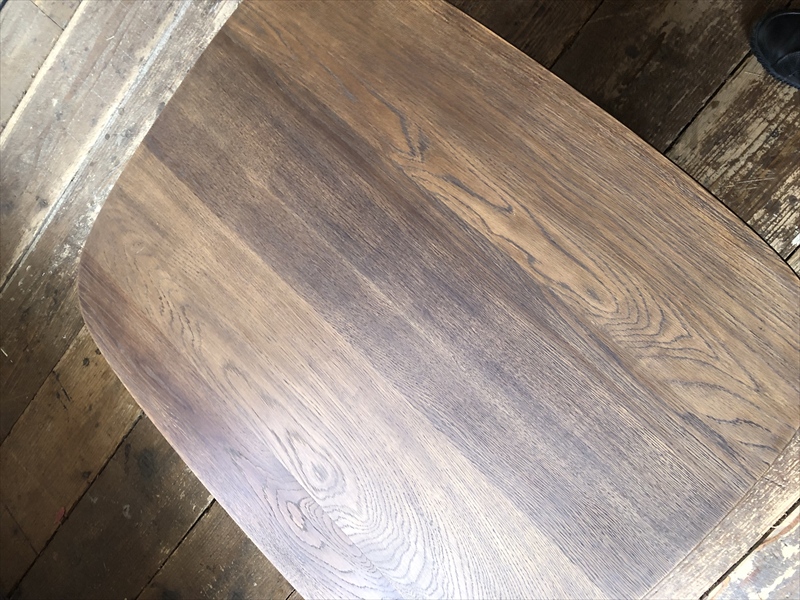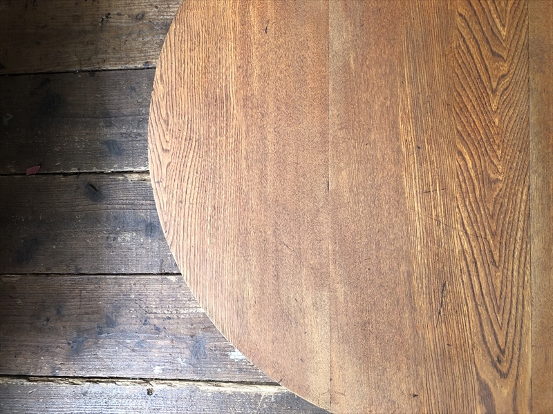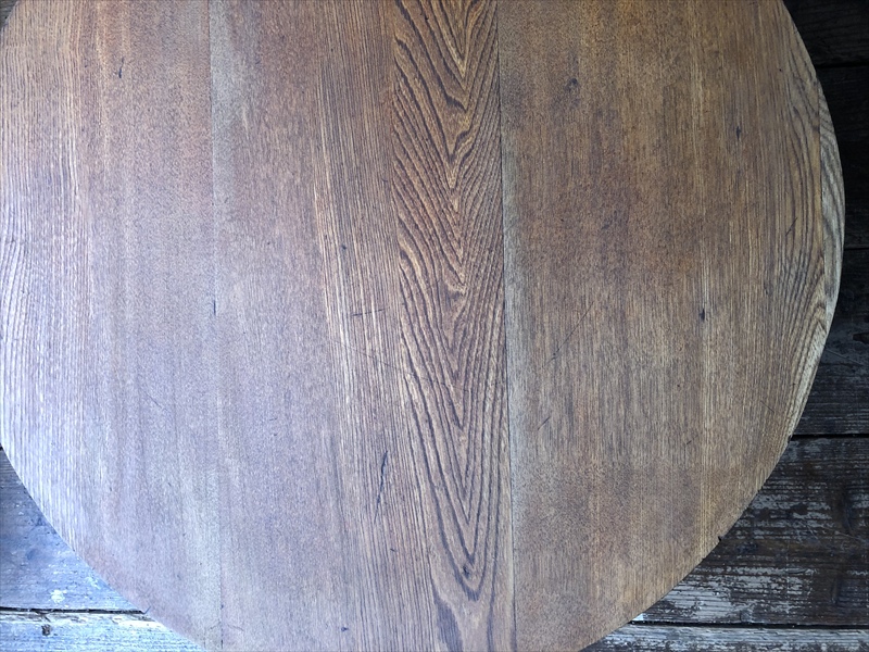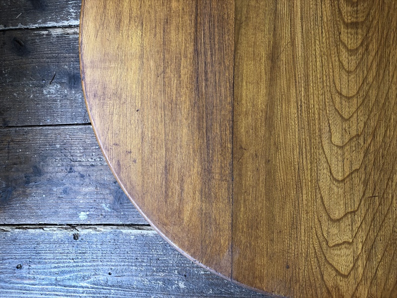 ニレという木(ケヤキの仲間)でとても品のいい木目です。サイズも珍しく、5~6人くらいでご飯が囲めますよ。脚のデザインといい、大きさといい、天板といい、きれいな佇まいです。折りたたみもできます。