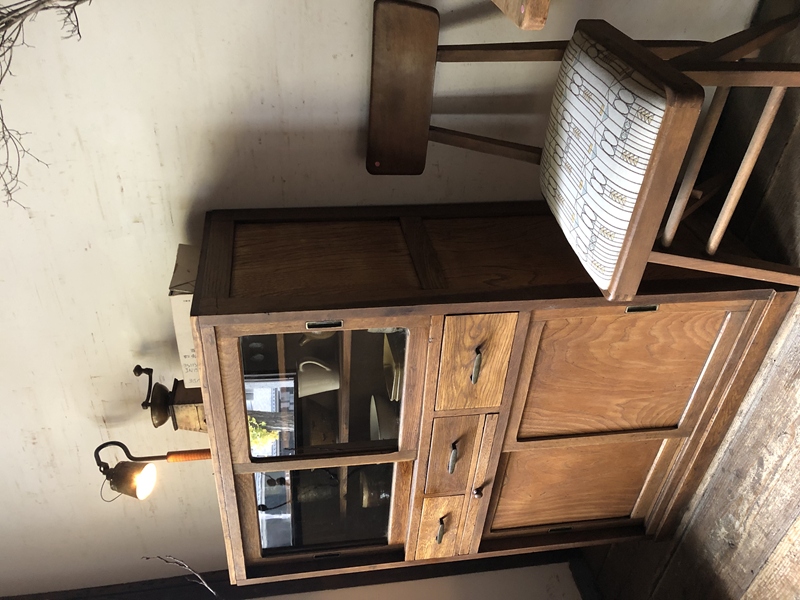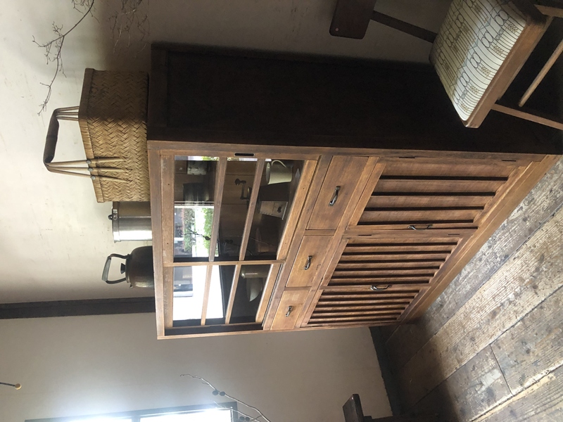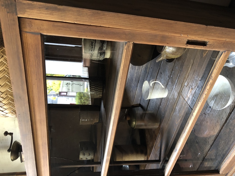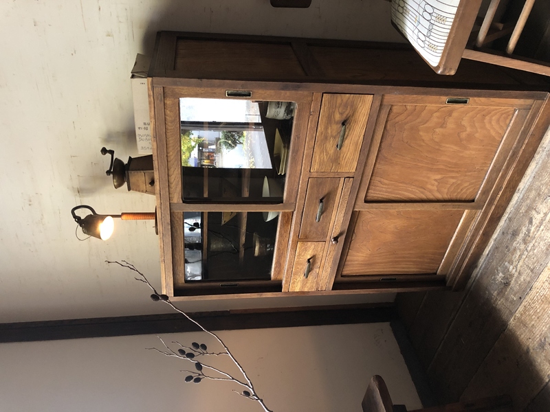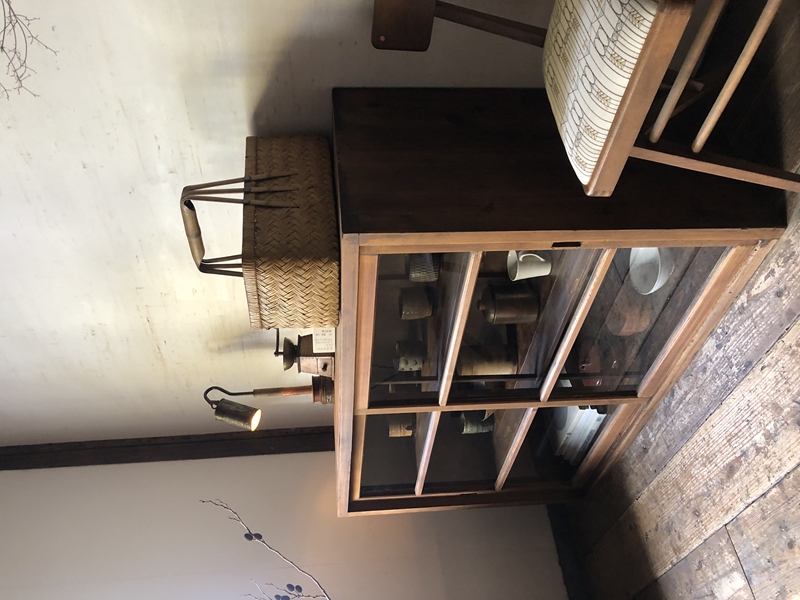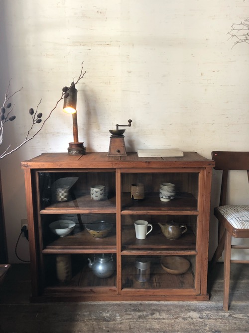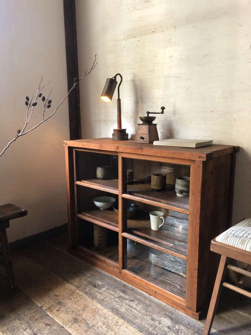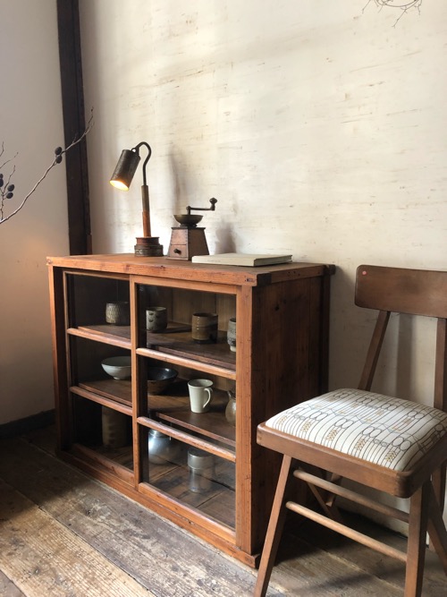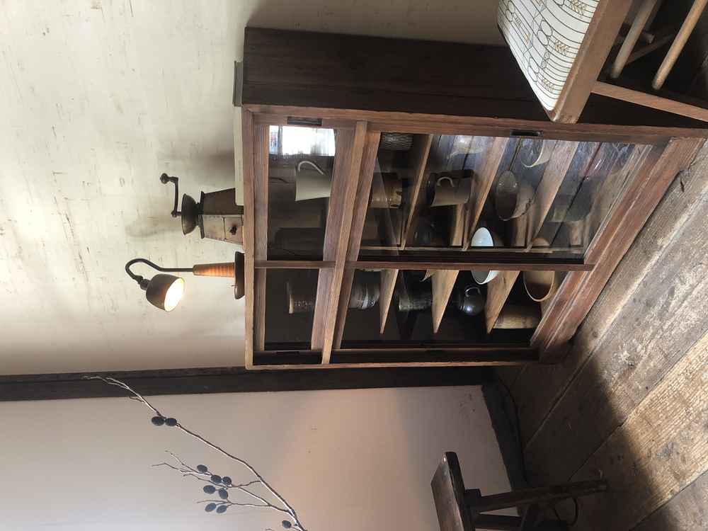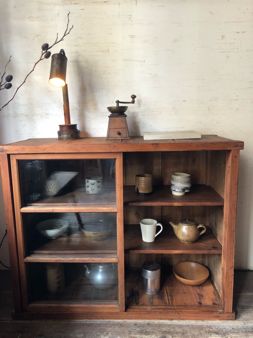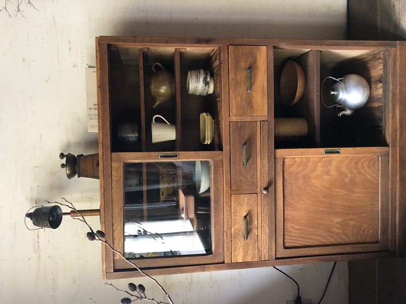 片扉のキャビネットです。大正時代のもので、取っ手も木の感じも格好いいです。お茶まわりのものだけ入れたり、酒器だけ入れてもなかなかよさそうです。