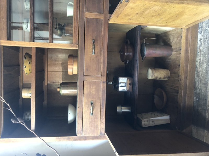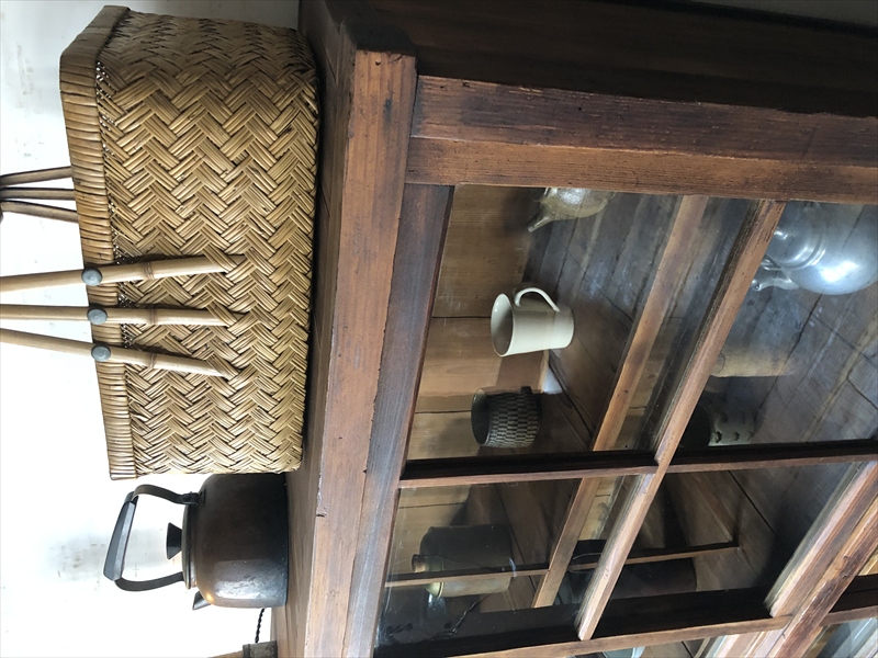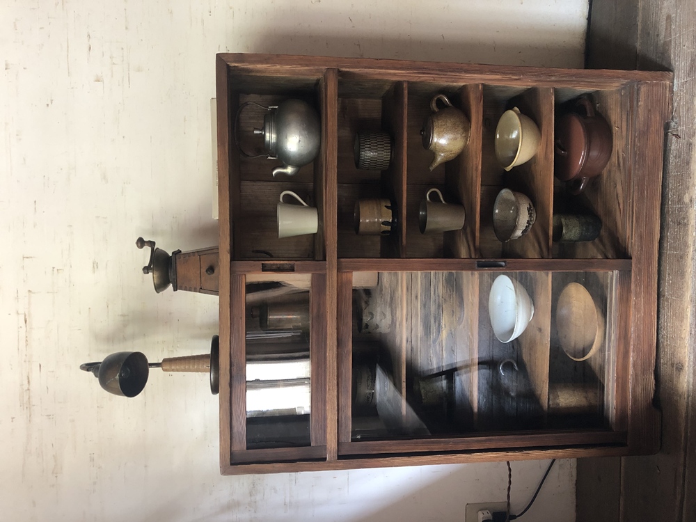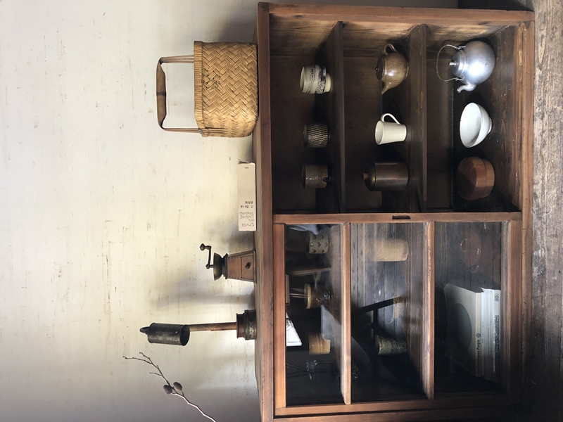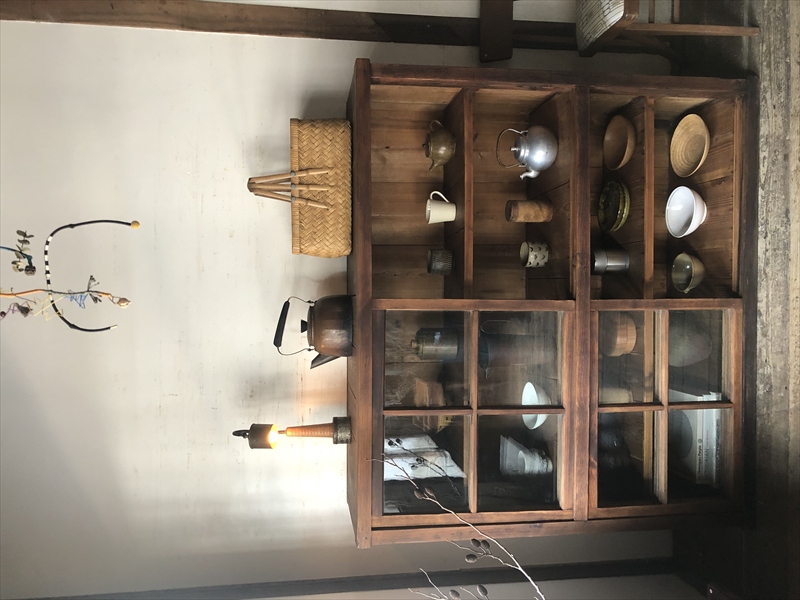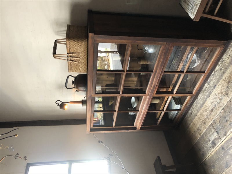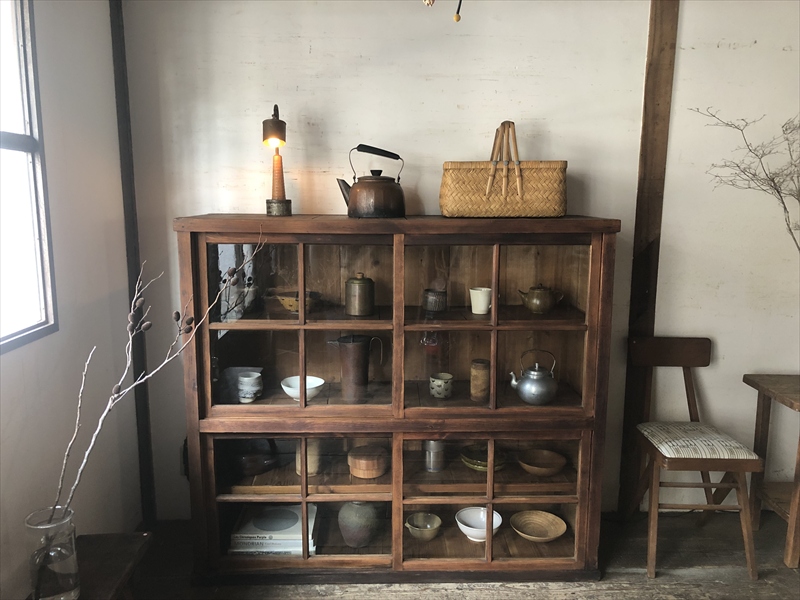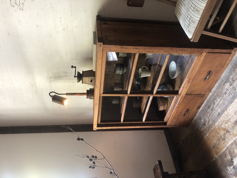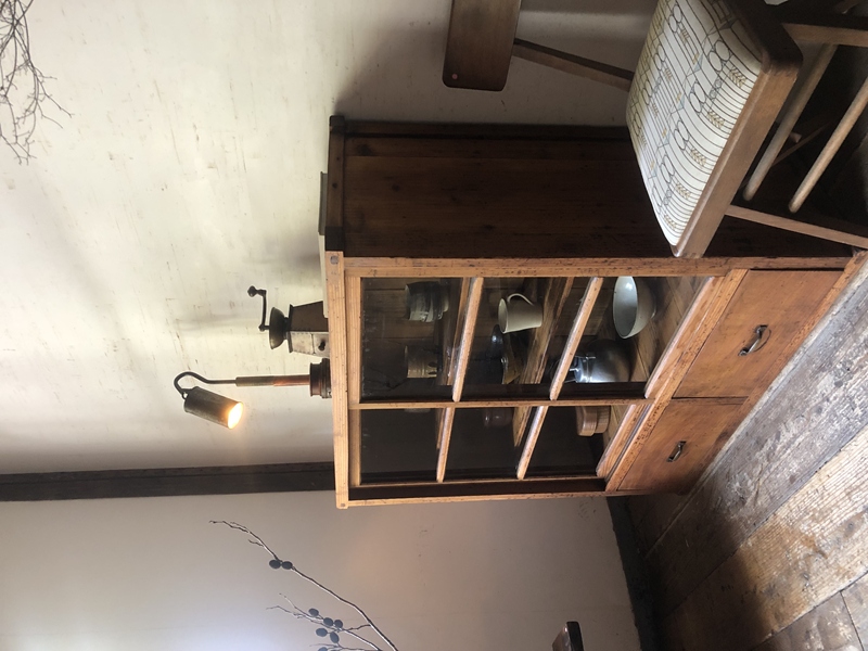 片扉のキャビネットです。大正時代のもので、取っ手も木の感じも格好いいです。お茶まわりのものだけ入れたり、酒器だけ入れてもなかなかよさそうです。