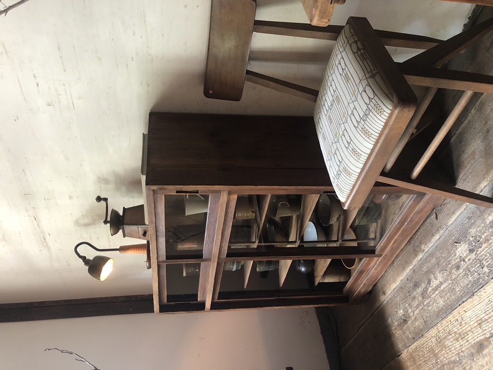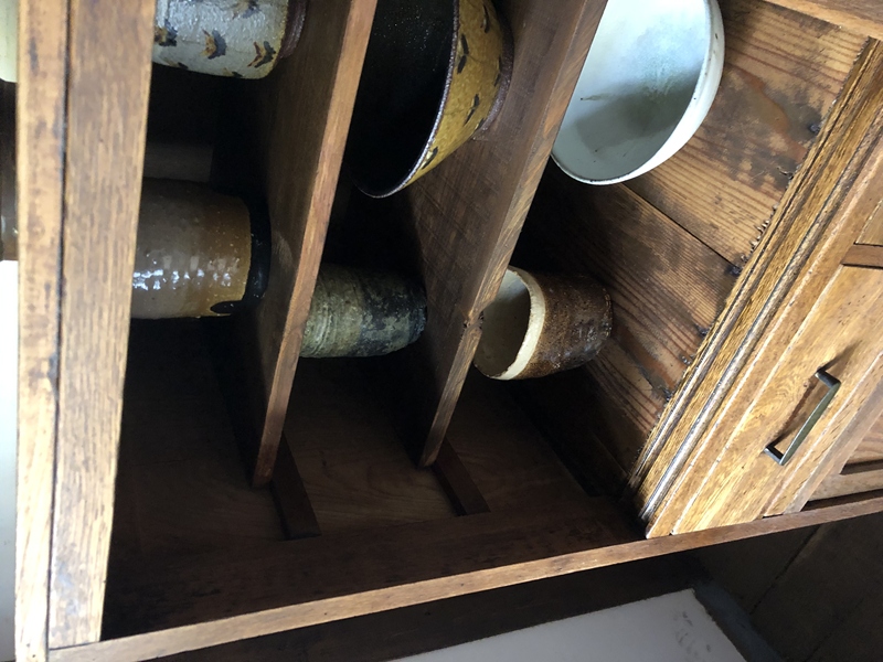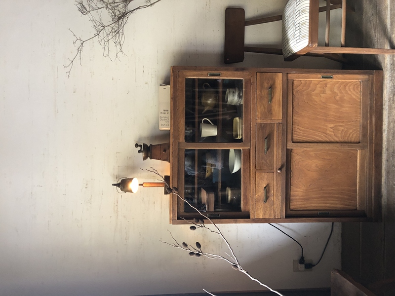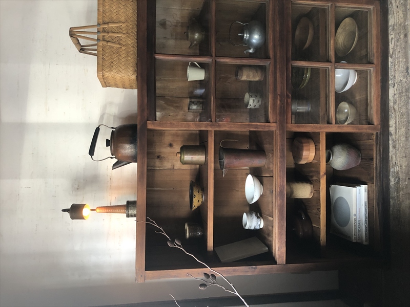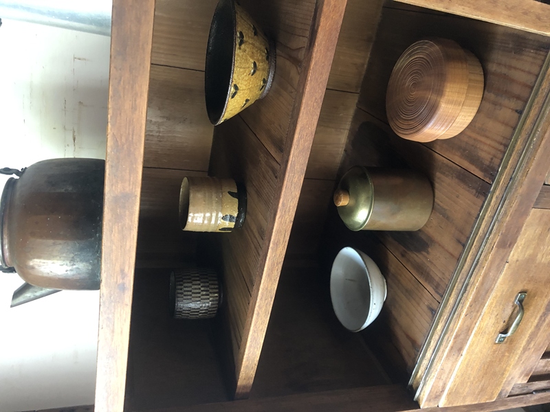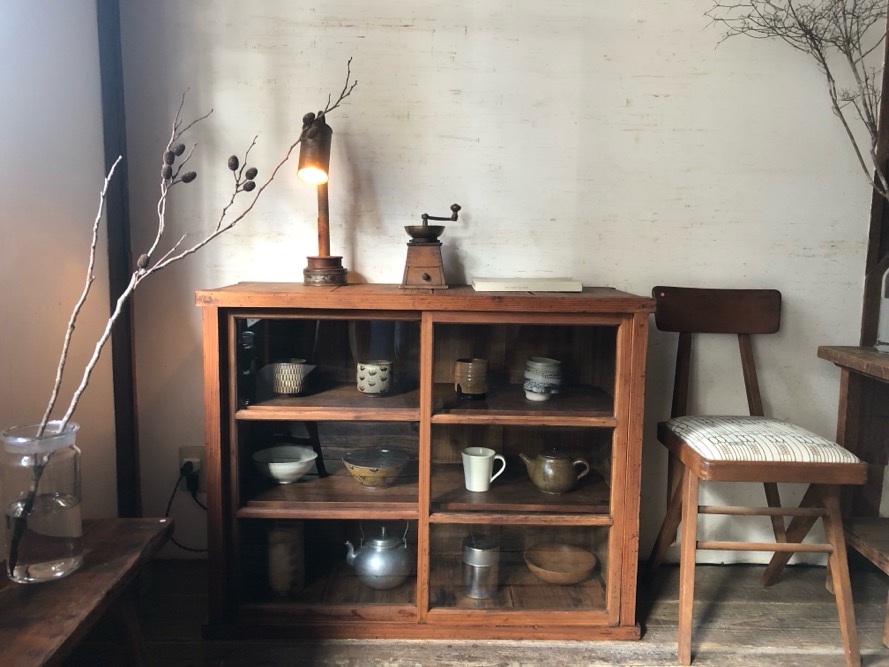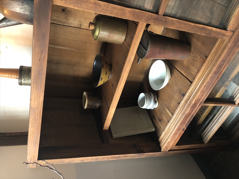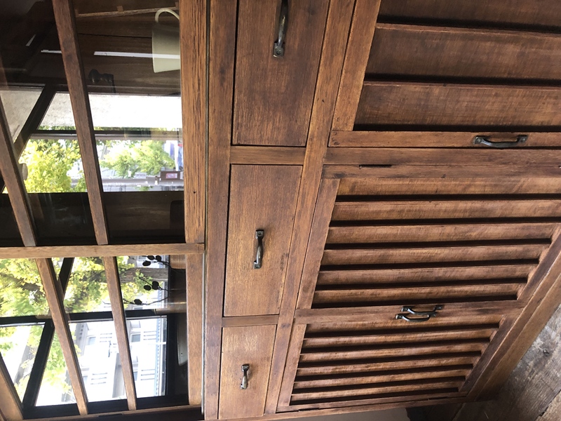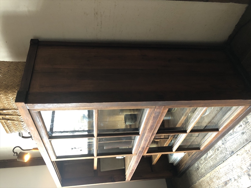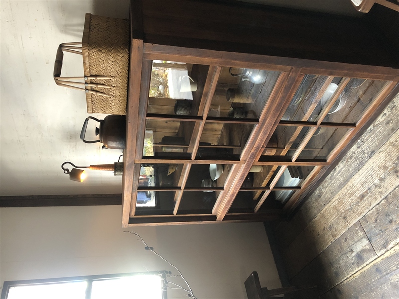 片扉のキャビネットです。大正時代のもので、取っ手も木の感じも格好いいです。お茶まわりのものだけ入れたり、酒器だけ入れてもなかなかよさそうです。