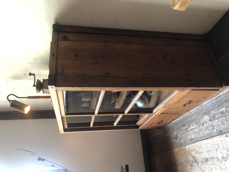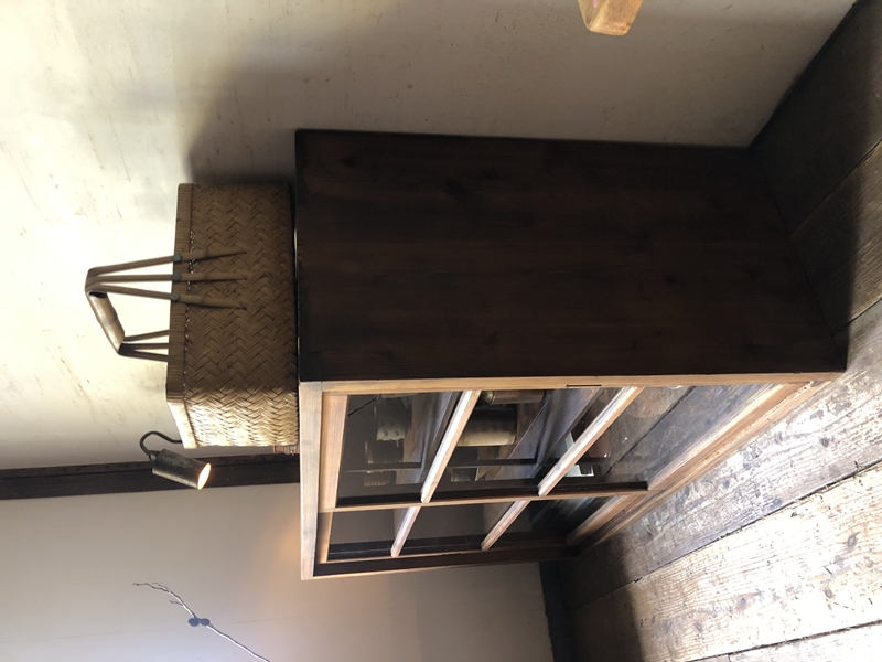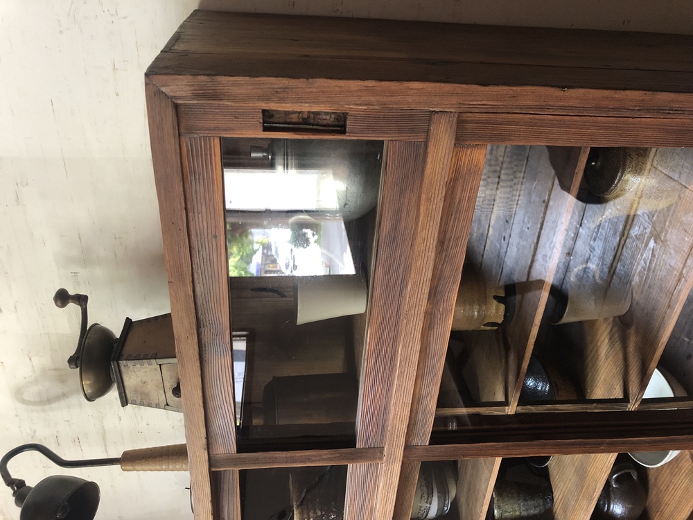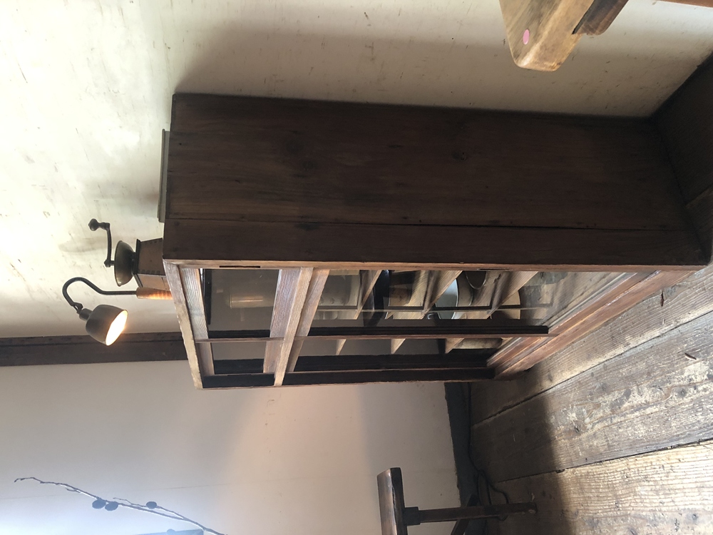 松の木の素俗な佇まいです。ガラスも古いままでとても雰囲気がいいです。本屋布類や、洋服ダンスにしても恰好いいと思います。リビングのサイドボードにもいいですよ。
