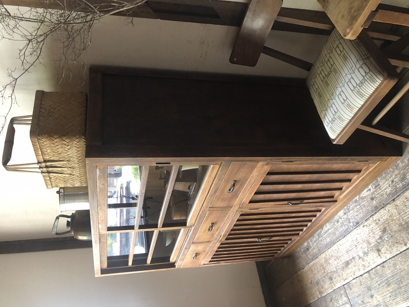 栗の水屋です。とろ~んとした栗のなんとも味のいい杢目です。扉がなかったのですが、下段、上段、どちらにも付けれますのでかえって取りやすいかも?棚板も取れますので背の高いモノも入ります。引き出しにも沢山収納出来ます。見た目が美しいので台所でもリビングでもどちらでも似合います。和と洋のあいだですね。天板もしっかりしてますので重いモノ置いても大丈夫です。梅酒の瓶もスッと取れる高さです。大きすぎず、小さすぎず。