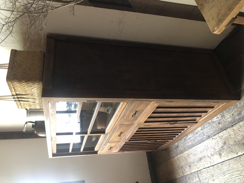 杉の木戸水屋です。枯れた杉の木で渋い色です。明治の初め頃のモノで渋くもあり、モダンにも見えます。お玄関や和室やシュッとした空間にも場がしまります。奥行も狭いので圧迫感なく置けます。見た目よく色々収納出来ますね。