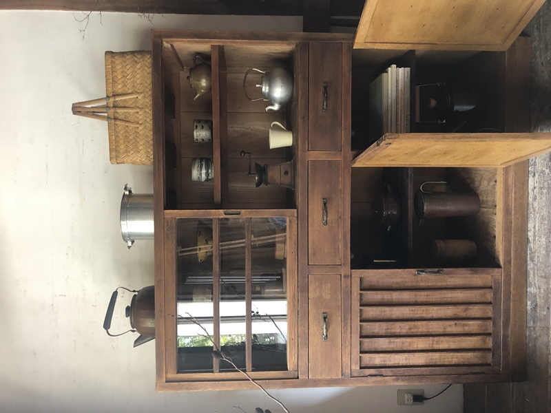 ラワンの水屋です。素朴で良い味のラワンの杢目です。天板もとてもカッコいいです。食器も飾りながら沢山収納できますし、棚板が外せますのでA4サイズも入り、本棚にもなります。奥行が狭く、横幅も珍しくこれなら置けそうですね。