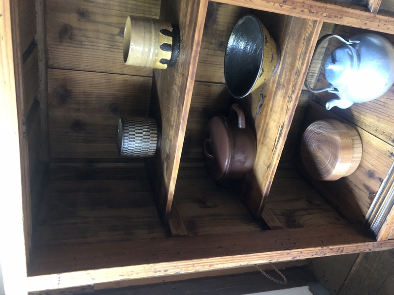 天板にいろいろ乗せやすい高さで、棚板も3枚ついていますので沢山、食器が収納できます。素朴な木味の水屋です。