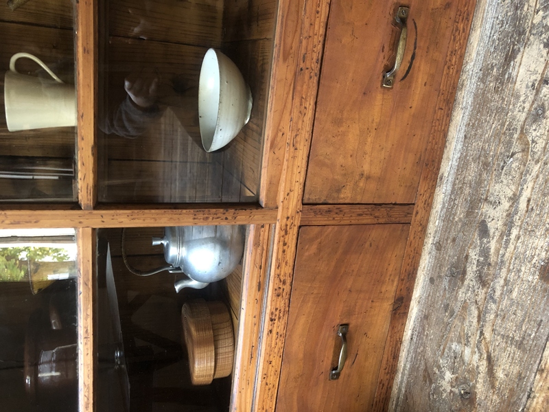 下の段には大きい本も入りますので、食器と本を一緒に収納したり、ワイングラスなど背の高いものを入れたり、色んな使い方ができます。ガラスも古いヒュルヒュルガラスで、とても雰囲気のいい水屋です。天板にも色々置きやすい高さです。