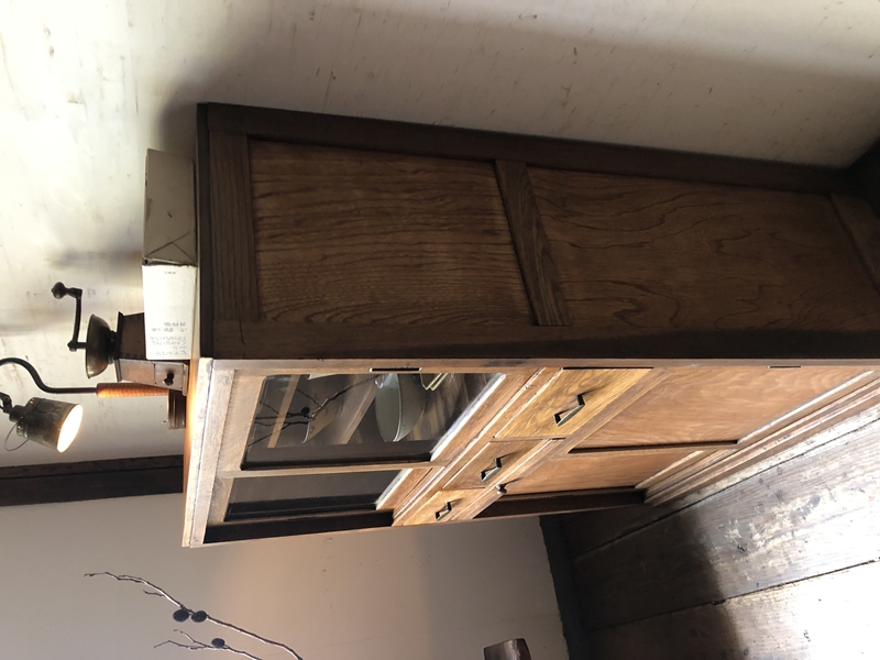楢の食器棚です。ナラらしいトラ目の杢目が美しいです。昭和20~30年代のモノでまるで名建築のようにモダンで美しいです。見た目もいいですが収納も沢山入ります。棚板も外れますので背が高いグラスなども入ります。店主の初見の食器棚です。これが最初で最後だとおもいます。