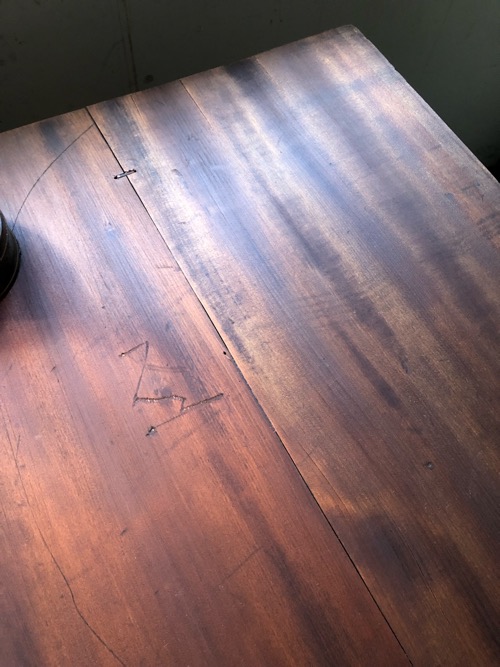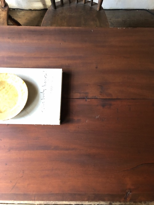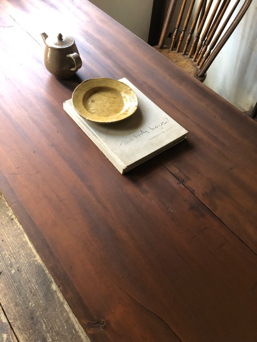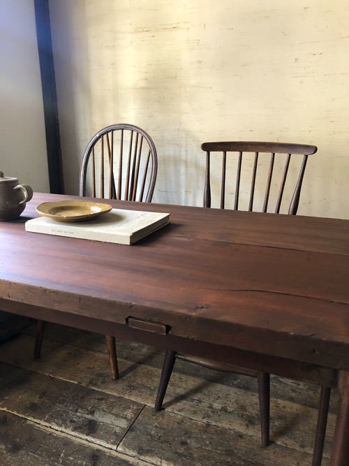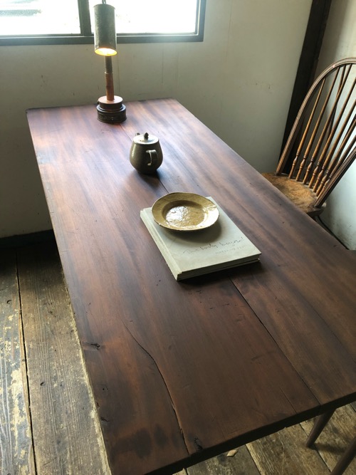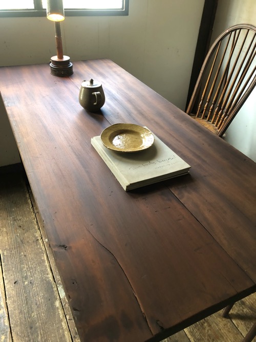 天板は栗の一枚板で、全部栗の木で作られた机です。なんとも味があり、いい雰囲気です。脚のあいだに木がありませんので、四方向から椅子が入ります。2~4人くらいで、ご飯が囲めます。