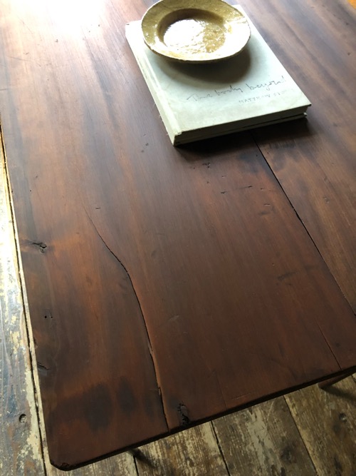松の木のテーブルです。縫製工場で使われていました。天板も厚めで、脚もとてもしっかりしています。6~8人くらいでごはんが囲めます。味があって、素朴で理想的なテーブルです。